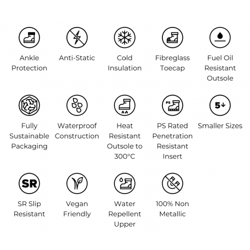 The RF290 Silt is a robust safety wellington, engineered for challenging outdoor work settings. Its waterproof, flexible upper is made from natural rubber and neoprene and keeps feet shielded from the elements, ensuring dryness and comfort in damp conditions. Durable rubber overlays at the toe and heel provide ankle protection and enhanced resistance against scuffs and knocks, extending the boot's lifespan. Safety is paramount, with a non-metallic composite toecap safeguarding against impact and compression injuries whilst a penetration resistant midsole protects against underfoot punctures. A cushioned midsole and removable comfort footbed offer all-day support and reduce strain during extended periods of wear. The high-traction, rugged FORCE10® outsole delivers superior traction on unstable or slick terrains, providing confident footing in diverse environments. By using renewable bio-based materials, we are trying to reduce our reliance on traditional fossil-fuel based rubbers